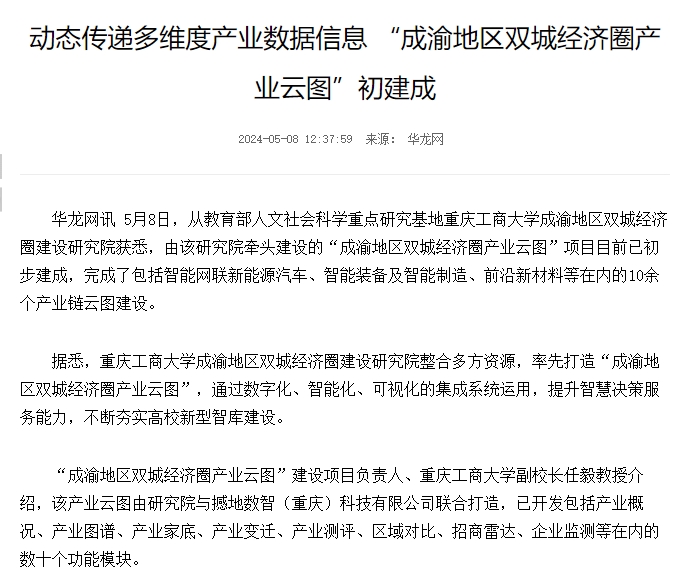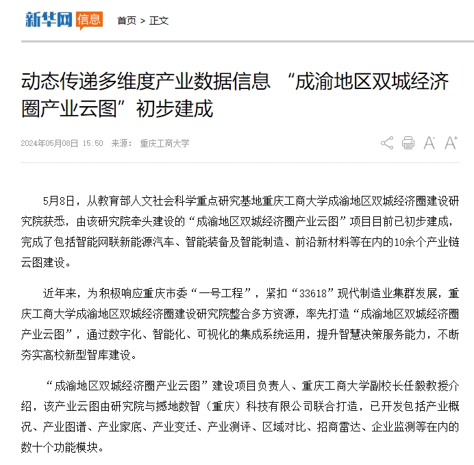 近年来,为积极响应重庆市委“一号工程”,紧扣“33618”现代制造业集群发展,365官网教育部人文社会科学重点研究基地-成渝地区双城经济圈建设研究院整合多方资源,率先打造“成渝地区双城经济圈产业云图”,通过数字化、智能化、可视化的集成系统运用,提升智慧决策服务能力,不断夯实高校新型智库建设,完成了包括智能网联新能源汽车、智能装备及智能制造、前沿新材料等在内的10余个产业链云图建设。新华网、华龙网对此进行了报道。
