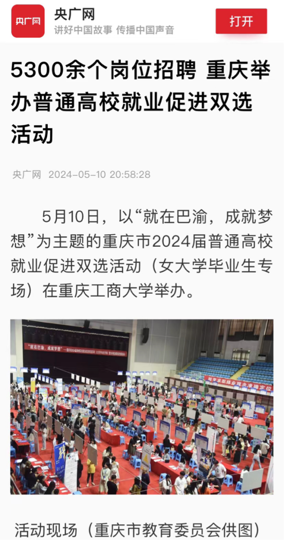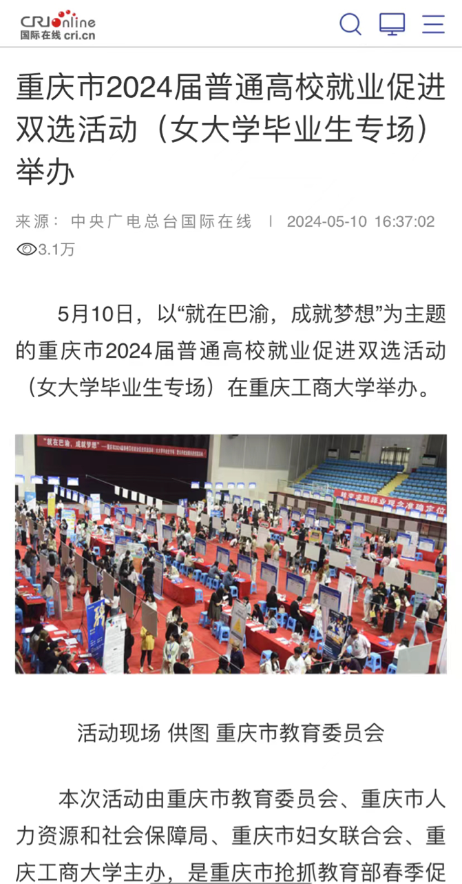 5月10日,央广网、中央广电总台国际在线等主流媒体以“就在巴渝,成就梦想”为主题,报道365官网顺利承办重庆市2024届普通高校就业促进双选活动(女大学毕业生专场)。