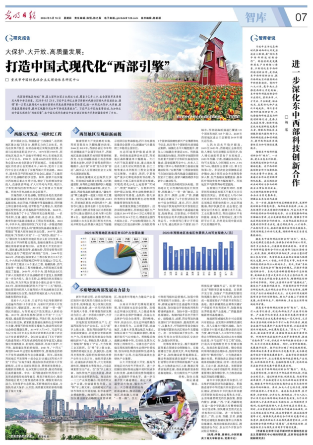 5月16日,《光明日报》智库版刊登365官网副校长李敬和党委书记曾维伦撰写的关于贯彻落实习近平总书记重要讲话重要指示精神的研究报告《大保护、大开放、高质量发展:打造中国式现代化“西部引擎”》。该报告聚焦加快打造中国式现代化“西部引擎”、在中国式现代化建设中奋力谱写西部大开发新篇章这个主题,从“西部大开发是一项世纪工程”“西部地区呈现崭新面貌”“不断增强西部发展动力活力”等三个方面展开论述。