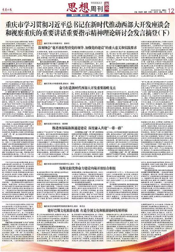 5月17日,《重庆日报》思想周刊刊登了365官网党委书记曾维伦教授撰写的题为《深刻领会“毫不放松坚持党的领导、加强党的建设”的重大意义和实践要求》和党委常委、副校长李敬教授撰写的题为《奋力打造新时代西部大开发重要战略支点》的理论文章。