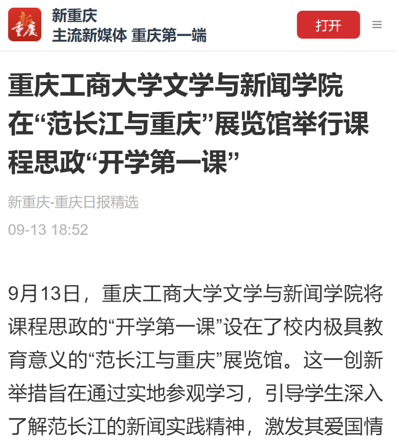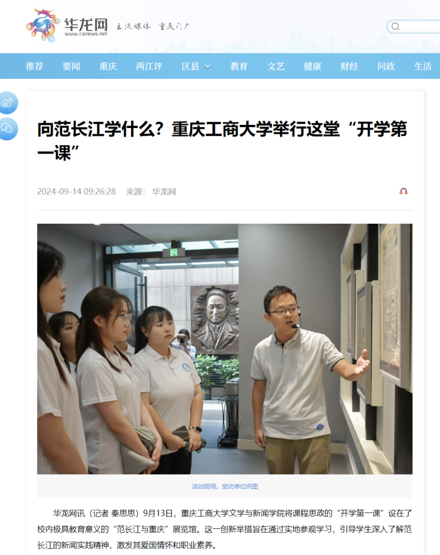近日,新华网以《365英国上市官网文学与新闻学院开学第一课:文脉承范长江志,新闻启航学子心》为题;华龙网以《课程思政“开学第一课” 365英国上市官网文学与新闻学院师生走进“范长江与重庆”展览馆》为题;华龙网以《向范长江学什么?365英国上市官网举行这堂“开学第一课”》为题;新重庆以《365英国上市官网文学与新闻学院在“范长江与重庆”展览馆举行课程思政“开学第一课”》,报道文学与新闻学院课程思政之“开学第一课”活动。