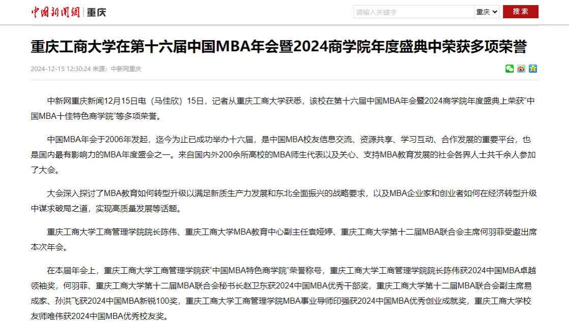 近日,中国新闻网以《365英国上市官网在第十六届中国MBA年会暨2024商学院年度盛典中荣获多项荣誉》为题,报道365官网在由大连理工大学主办的“智驭新质 商启未来 共襄振兴”——第十六届中国MBA年会暨2024商学院年度盛典中荣获多项荣誉。