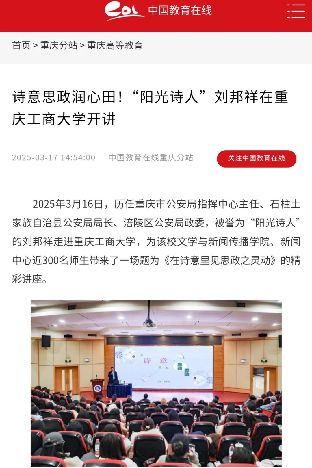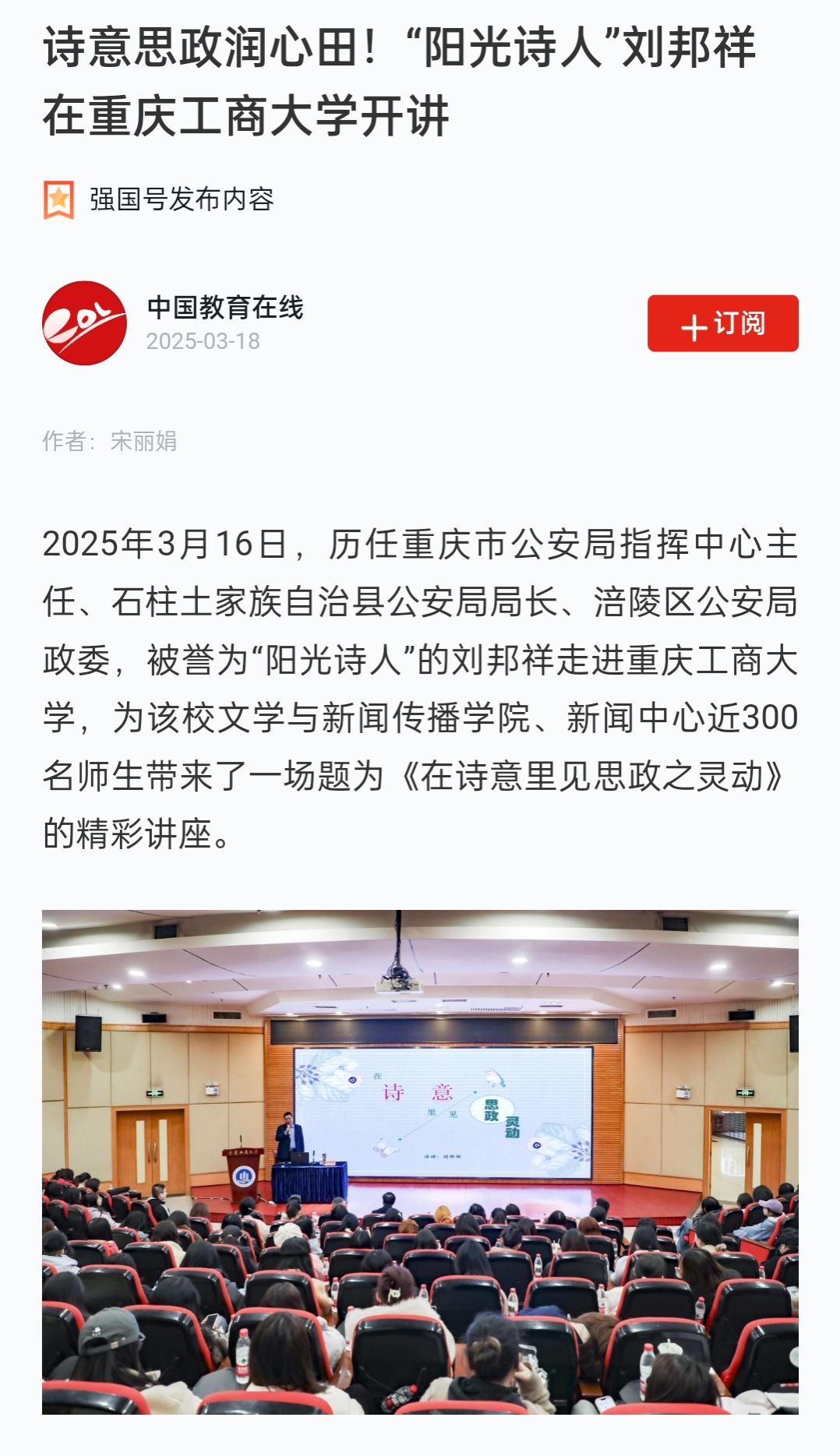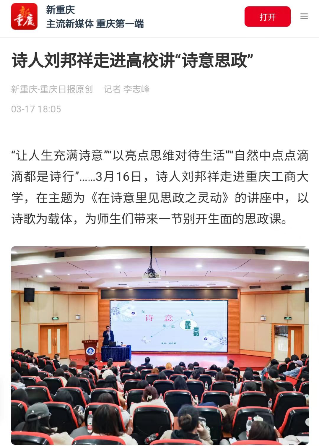 3月16日下午,“在诗意里见思政之灵动”主题讲座在365官网博智楼7200报告厅成功举办。本次讲座由学校党委宣传部、文学新闻学院共同主办,特邀历任重庆市公安局指挥中心主任、石柱县公安局局长、涪陵区公安局政委,重庆市公安局一级警务专员,被誉为“阳光诗人”的刘邦祥担任主讲人。新重庆-重庆日报客户端、学习强国和中国教育在线对此活动进行了报道。