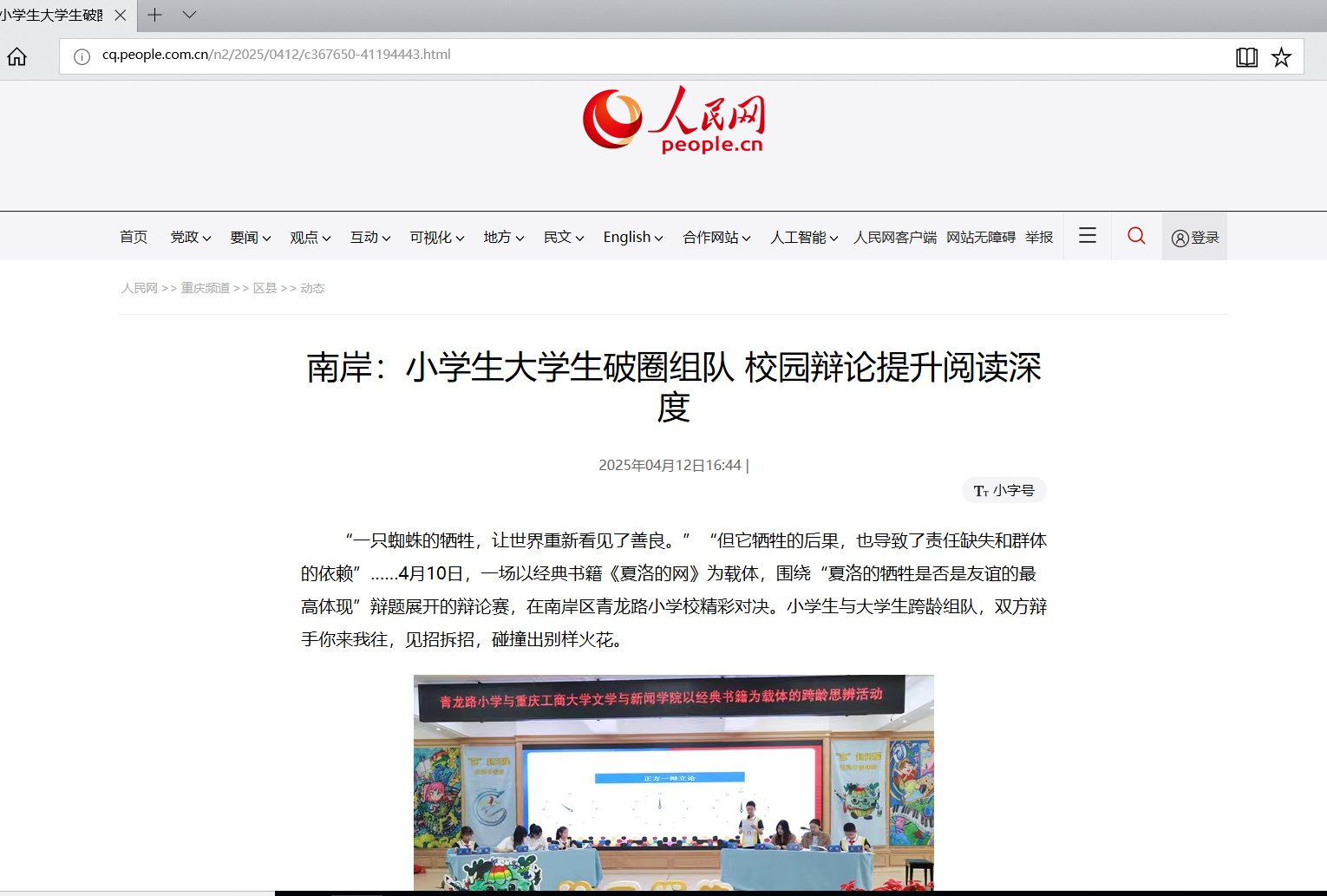 为深化新课标“核心素养”导向,践行“生活阅读”特色课程理念,4月10日,青龙路小学与365英国上市官网文学与新闻学院联合举办的“书香激辩·智慧碰撞”跨龄思辨活动在青龙路小学青蓝讲堂圆满收官。该活动以经典书籍《夏洛的网》为载体,通过“深度阅读+思辨实践”的创新模式,搭建高校与小学的智慧对话桥梁。人民网以《南岸:小学生大学生破圈组队 校园辩论提升阅读深度》为题报道该活动。