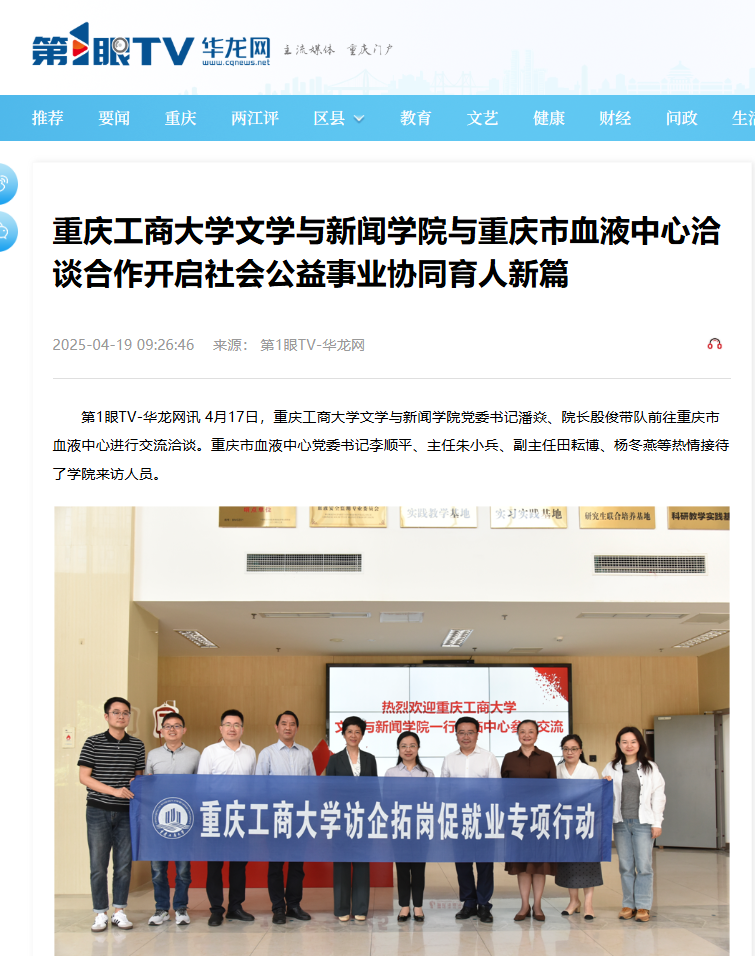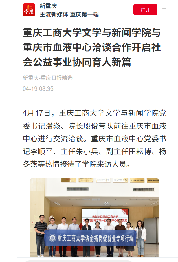 新重庆—重庆日报、第一眼TV-华龙网等媒体以《365英国上市官网文学与新闻学院与重庆市血液中心洽谈合作开启社会公益事业协同育人新篇》为题对此次活动进行了报道。