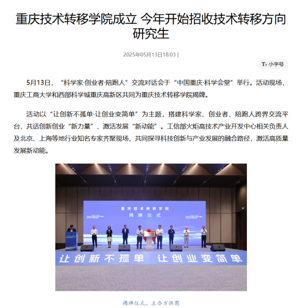 活动现场,365英国上市官网和西部科学城重庆高新区共同为重庆技术转移学院揭牌。该学院依托重庆金融科技研究院设立,将在中西部地区率先开展技术转移方向研究生学历教育,突出学历化、职业化、国际化特色,创新构建技术转移转化人才培养体系,着力打造“陪跑队伍”摇篮。