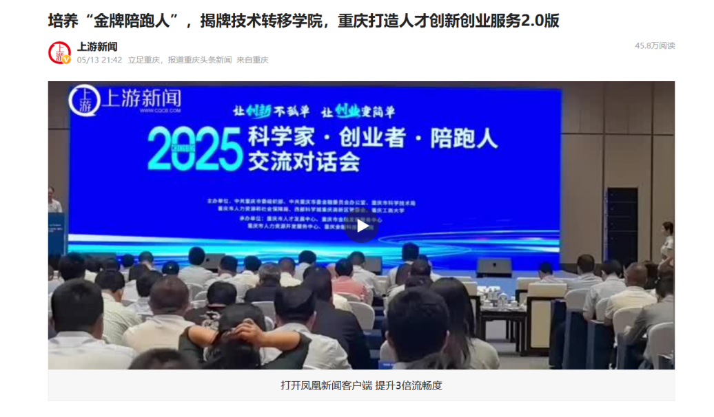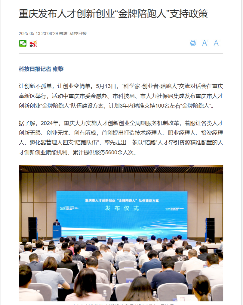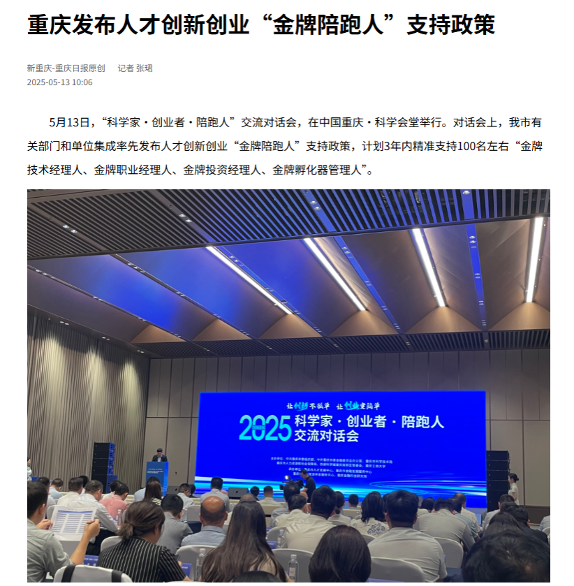 5月13日,“科学家·创业者·陪跑人”交流对话会在中国重庆·科学会堂举行,本次活动由市委组织部、市委金融办、市科技局、市人力社保局、西部科学城重庆高新区管委会和365官网共同举办。我市有关部门和单位在会上集成发布重庆人才创新创业“金牌陪跑人”支持政策,在省级层面率先将服务人才创新创业实绩突出、取得重大标志性成果的陪跑人体系化纳入高层次人才认定范畴享受相应服务。