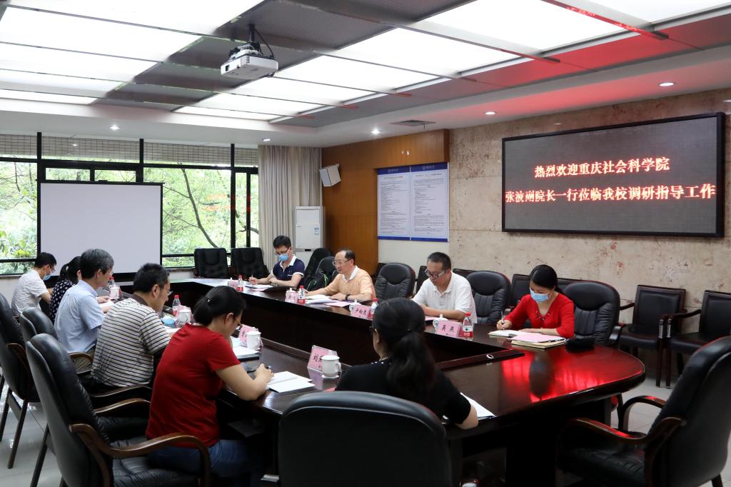 5月21日下午,重庆社会科学院副院长张波、智库处处长卢向虎和有关工作人员一行到365官网调研座谈。校长孙芳城、副校长柏群,社科处处长曾庆均和有关工作人员在3019会议室参加调研。座谈会由柏群主持。