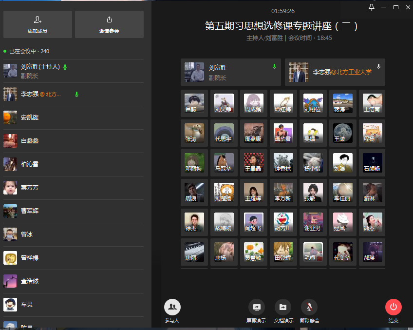 4月22日晚,北方工业大学马克思主义学院李志强教授应邀通过企业微信平台在线为365官网“习近平新时代中国特色社会主义思想研究”选修课作了题为“坚持依法治国与以德治国相结合”的专题学术报告。李志强教授是中央马克思主义理论研究与建设工程专家、北京市思想道德修养与法律基础研究会副秘书长,北京市优秀教师,北京市思想政治理论课特级教师。学校党委常委、副校长何勇平,马克思主义学院院长王仕勇、副院长刘富胜,部分思政课专兼职老师、“习近平新时代中国特色社会主义思想研究”选修课第五期232名学员,参加了此次“云”端报告会。本次会议由刘富胜主持。