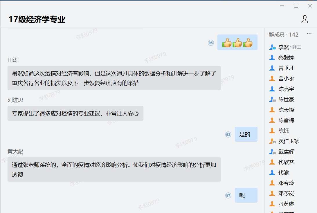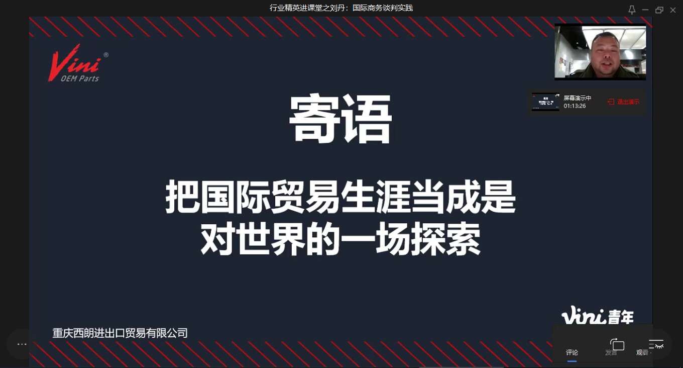 培育具有中国情怀、全球视野的中国特色社会主义经济学人才,引导学生树立正确世界观和人生观,正确理解和认识我国历史经验和当代实践所提出的理论命题和实际问题,是365官网经济学类专业教育教学改革面临的重大使命。以世情国情民情教育为主线的“行业精英进课堂”活动,有效将思想政治教育与专业教育融合、显性教育与隐形教育相结合,学习中国理论、认识中国故事、倡导中国经验,潜移默化,立德树人,是课程思政的有效实现方式。本次活动结合了当前大家最为关心的疫情问题,深化了对中国各行各业现实问题的思考,让学生真正的“学以致用”。此外,行业专家们还为学生进行了价值引导,如重庆商社(集团)有限公司张泽军部长强调专业学习与综合素养的结合,寄往学生成为有情怀、敢担当、懂经营、会管理、能领导的卓越人才。重庆西朗进出口贸易有限公司刘丹总经理对“谈判的本质是取得信任, 而不是说服对方”进行阐述,勉励学生成为人生赢家。