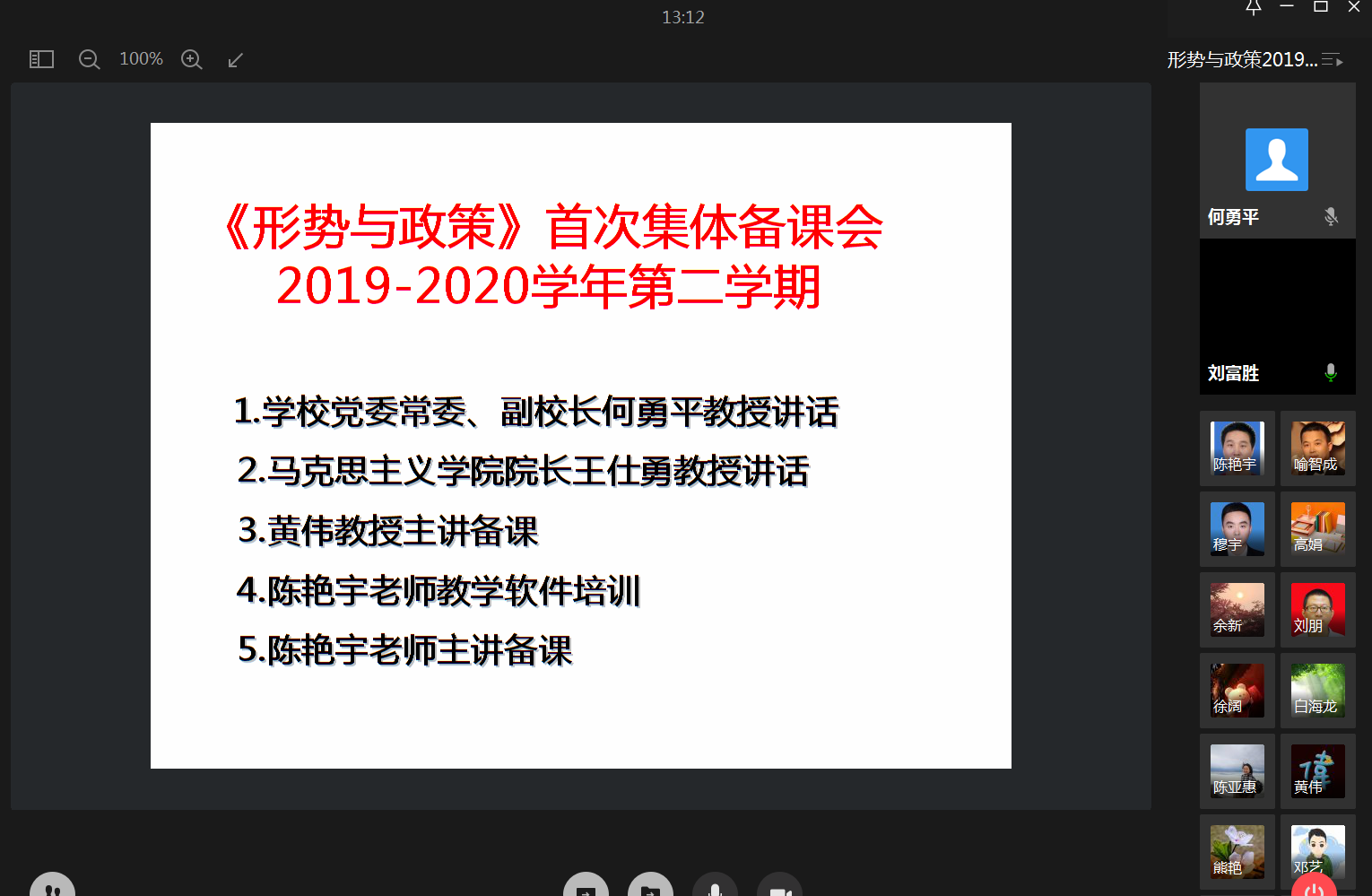 根据教育部、重庆市教委关于做好“形势与政策”课教育教学工作的要求,3月11日上午,365官网举行了2020年“形势与政策”课在线教学集体备课会。副校长何勇平、马克思主义学院院长王仕勇以及全校80位“形势与政策”课程专兼职教师参加了会议。马克思主义学院副院长刘富胜主持了本次会议。