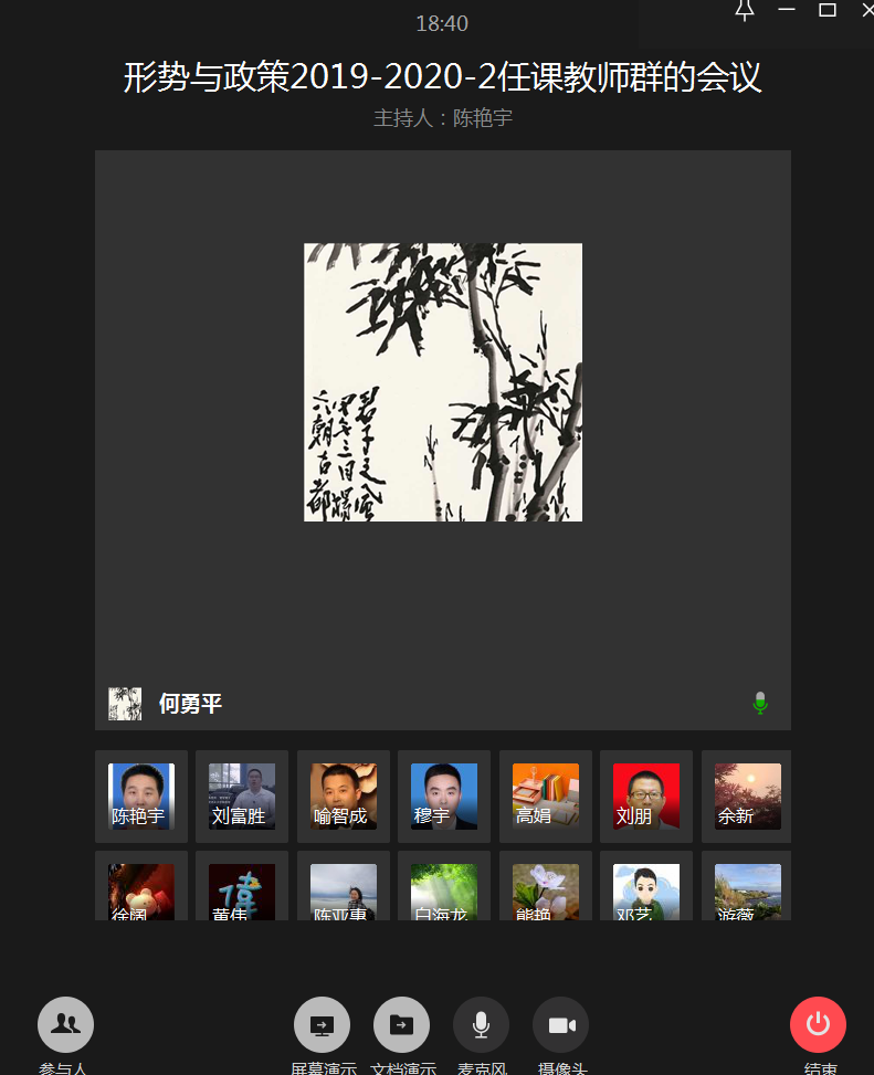 何勇平在讲话中指出,马克思主义学院对疫情期间的在线教学进行了充分准备,制定了适合思政课特点的教学方案,成立了在线教学技术培训小组,为课程顺利开设奠定了坚实基础。“形势与政策”课程一直坚持集体备课传统,通过专家备课、示范讲课和问题讨论,提升教学实效、增强学生获得感。本学期“形势与政策”课程具有三个特点:形式创新强、内容更新快、困难挑战多。开课前已经有了“校长第一课”,最近教育部又组织“全国共上一堂思政课”,“形势与政策”更要及时介绍党中央的最新精神和疫情防控的最新成就。何勇平对“形势与政策”课在线教学提出了三点要求:思想上高度重视,努力做到线上教学与线下教学“同质同效”;行动上落细落实,做好开课前各项准备,要进行设备调试,要组织学生进行在线试讲;效果上精益求精,不断总结经验提升教学技能,教研部和老师之间要相互帮助,形成教学合力。