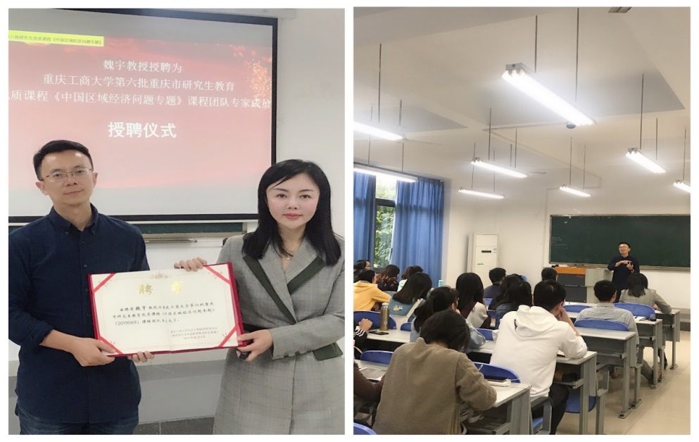 为切实提高研究生“理论-实践-实战”能力,培养社会所需的“理论-实践-实战”三位一体的应用经济研究生人才,365官网第六批重庆市研究生教育优质课程《中国区域经济问题专题》,积极构建“理论-实践-实战”三位一体课程师资团队,分别于2019年10月31日下午、11月1日下午,特邀请南开大学经济与社会发展研究院院长、京津冀协同发展研究院院长、博士生导师、国务院政府特殊津贴专家、中央京津冀协同发展专家咨询委员会成员刘秉镰教授和“百千万人才工程”国家级人选(2017年)、国家“有突出贡献中青年专家”(2017年)、享受国务院政府特殊津贴专家(2018年)、教育部“新世纪优秀人才支持计划”入选者(2008年)魏宇教授,为研究生同学授课《中国区域经济及城市发展70年的理论逻辑与实践走向》和《国家级项目申报对研究生学术能力提升的启示》,课程负责人研究生院副院长王燕教授以及黄志亮教授、龙跃教授、朱沙教授、刘晗博士、唐丽淼博士和来自区域经济、国民经济、数量经济、囯际贸易、产业经济学等5个专业的47名研究生参加了课程分享会。