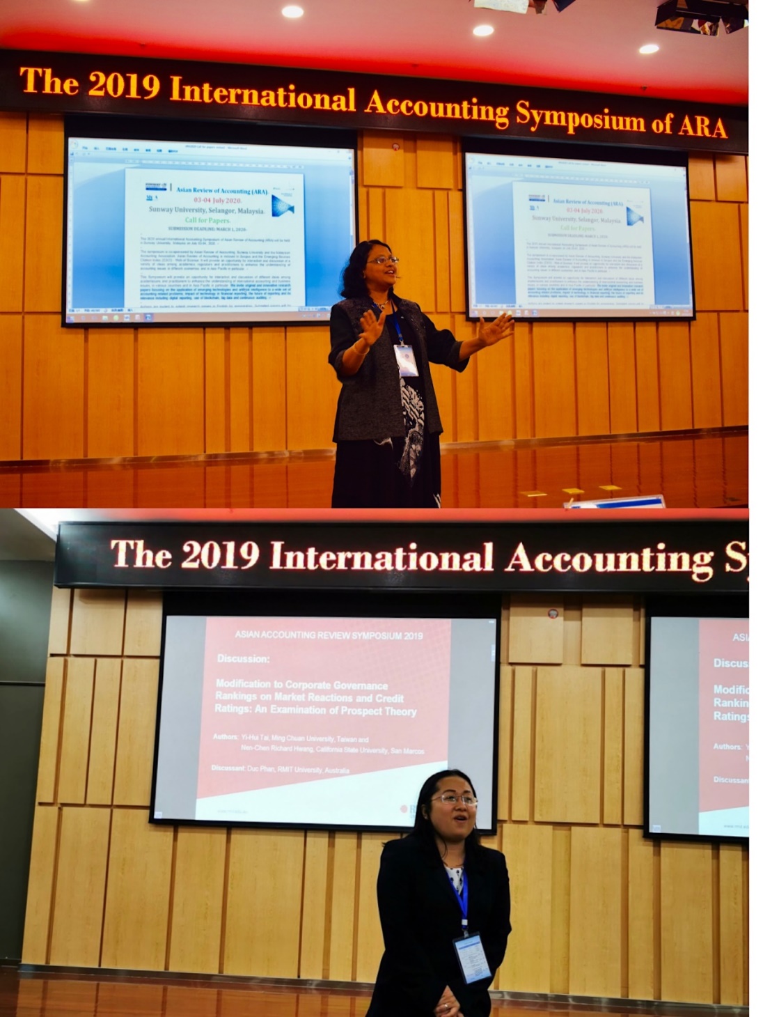最后,下一届承办方澳大利亚皇家墨尔本大学的Duc Phan教授和马拉西亚双威大学、马拉西亚会计学会会长Susela Devi教授分别发言。他们首先对365英国上市官网成功举办2019年亚洲会计评论学术年会表示祝贺,并对有机会承办2020年学术研讨会表示衷心的感谢。随后,Duc Phan教授和Susela Devi教授分别通过短视频方式对皇家墨尔本大学和双威大学进行了介绍,并诚挚邀请各位专家学者参加2020年的学术年会。