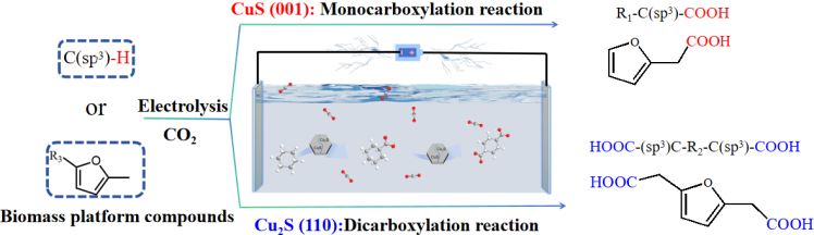 利用电催化实现惰性C(sp3)-H键活化与CO2羧化制备高值羧酸,是达成碳中性目标的可持续路径。然而,传统催化方法在该领域面临诸多挑战,如反应条件苛刻、催化活性和选择性难以满足需求等。针对上述问题,团队通过Cu-S键晶体工程,设计并制备了具有特定晶面暴露的六方CuS(001)和Cu2S (110)电催化剂。其中,CuS(001)能高效实现烷烃和芳烃的C(sp3)-H键活化及CO2羧化,对单羧酸产物展现出近乎完全的化学选择性;Cu2S (110)则可实现烷烃和芳烃与CO2的高选择性二羧化反应。值得一提的是,团队还利用该技术将生物质平台化合物2-甲基呋喃转化为呋喃-2-乙酸,将2,5-二甲基呋喃转化为可降解聚合物前体呋喃-2,5-二羧酸,为生物质资源利用提供了新途径。未来,这一策略有望在精细化工、绿色合成等领域发挥重要作用,推动“双碳”目标下的化学工业可持续发展。