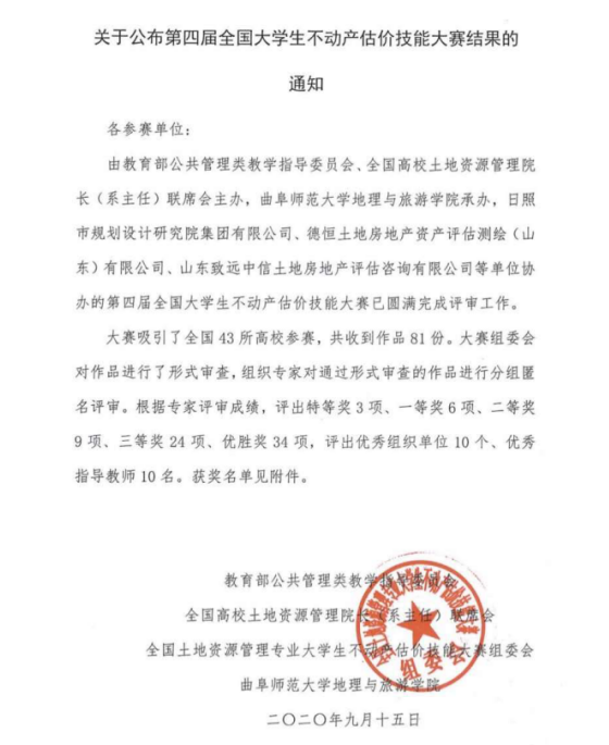 9月16日,第四届全国大学生不动产估价技能大赛圆满落下帷幕。365官网管理科学与工程学院派出1支队伍、共4位队员参加此次大赛,经过激烈角逐,最终获得了优胜奖。