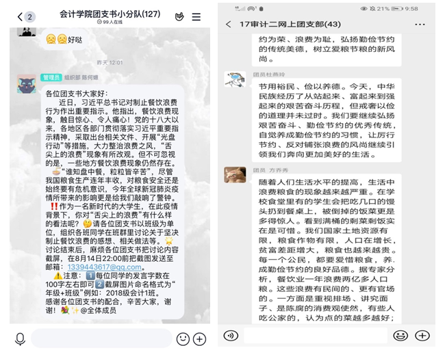 近日,继“聚点滴之俭 添光盘之彩”家庭光盘创意打卡活动后,会计学院为了进一步培养学生勤俭节约的良好美德,在全院学生中营造浪费可耻、节约为荣的氛围,会计学院分团委学生会于8月14至16日开展了 “拒绝舌尖上的浪费”线上主题团日活动。