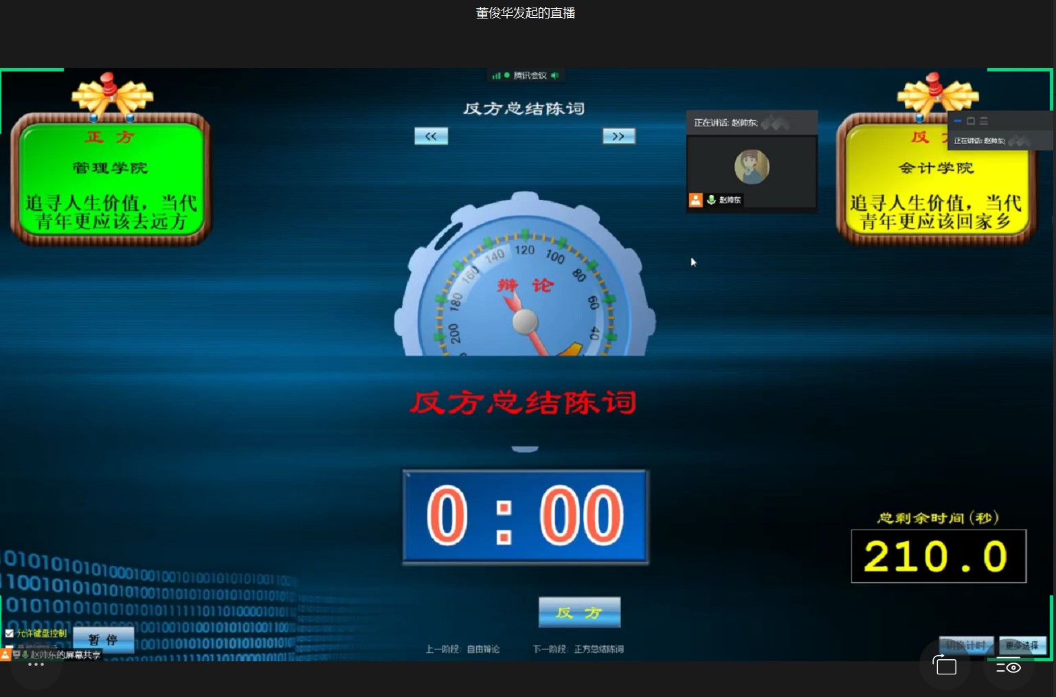 本届“工商杯”大学生辩论赛自2019年11月启动以来,凭借贴近民生民情和紧扣青年脉搏的丰富内容,吸引365官网近万名同学的持续关注和积极参与。面对突如其来的新冠肺炎疫情,主办方积极探索云端直播和转播的方式,邀请了清华大学校辩论队教练陶威锭等校内外专家进入直播间担任评委,为大赛给出专业的点评意见和建议,确保了比赛各个环节高质量运行。经过了小组赛、八强赛、半决赛、总决赛共计20余场线上线下的激烈角逐,最终,会计学院代表队获得冠军,管理学院代表队获得亚军,法学院、旅游与国土资源学院代表队获得季军,李夏、陈思羽、黄健航、刘艳、秦天等5名同学获得“最佳辩手”称号。