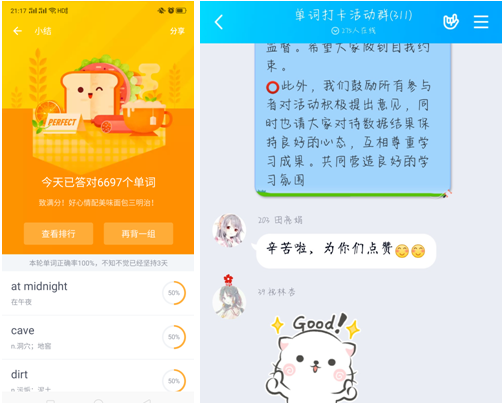 5月3日中午,主题为“宅家云学习,打卡共抗疫”的学风建设线上活动正式开始宣传,仅四个小时,活动咨询群人数就已达500人。前期宣传达到了意想不到的效果,得到了广大重工商大学子的积极响应。本次活动三个板块分别使用“有道背单词APP”、“番茄todoAPP”以及投票小程序辅助开展。5月6日活动正式开始,参与者们进行了连续三天的英语单词背诵和云自习室自习的打卡学习活动。随后,就参与者们的学习成果开展了最美笔记评选活动。