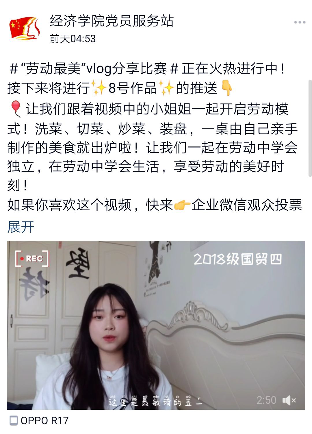 近日,经济学院党员服务站、分团委成功举办以“劳动最美”为主题的Vlog比赛,旨在让同学们自主地感受劳动的内涵、体会劳动的快乐、上一堂劳动教育课。虽然是线上活动,同学们仍然积极参与,视频的拍摄和制作质量都充分体现了同学们的“劳动最美”。视频内容非常丰富,不仅有令人垂涎的丰盛午餐还有打扫得一尘不染的家。聂敏琦同学在视频中说:“劳动的过程是既辛苦又快乐的,但劳动成果所带来的成就感是无法代替的”。党服站指导老师郝颖说:“挥洒劳动的汗水、体味劳动的艰辛,才能收获劳动的快乐,也才能真正理解劳动的内涵。我们教育工作者就是要不断强化劳动教育,让学生珍惜劳动成果、愿意劳动、热爱劳动。”