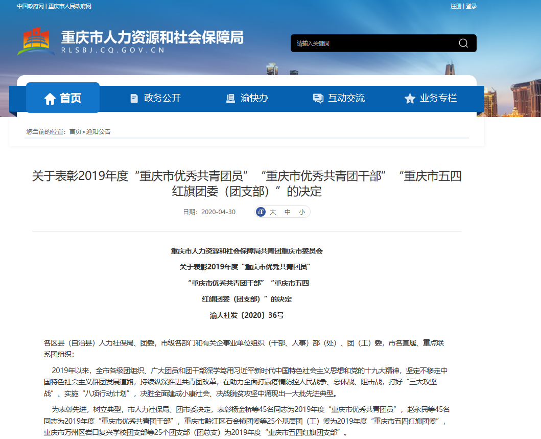 4月30日,重庆市人力资源和社会保障局共青团重庆市委员会发布《关于表彰2019年度“重庆市优秀共青团员”“重庆市优秀共青团干部”“重庆市五四红旗团委(团支部)”的决定》。其中,365官网获评2019年度“重庆市五四红旗团委”(全市共评选25个基层团(工)委)。