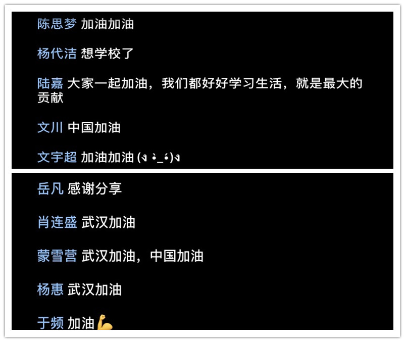 活动在视频《为爱逆行!坚守岗位抗击疫情的英雄们,也渴望回家》中开始,那些感动的瞬间温暖着屏幕前每一个人。家在重庆涪陵,来自管理学院的杨航分享到,在抗疫期间主要负责老旧小区的监管执勤,负责给隔离居民户送菜,父母的担忧、内心的恐惧也曾让他害怕,但是想到自己是一名党员,要勇担责任,他变得勇敢起来。来自艺术学院的崔敬博同学家住在河北,北方的冬天很冷,每天在外面执勤,他冻得脚尖都疼,仍坚持为社区居民测体温,还到当地县团委去参与疫情防控宣传,得到当地团委领导的好评。来自计信学院的万小波在四川宜宾家乡负责关卡的管控,当他看到无数党员干部冲锋在前,作为入党积极分子的他也毅然决定加入他们的队伍。来自机械工程学院的颜佳良同学,家住重庆渝北,从1月底开始就跟着父亲一起在高速路口工作,有时一天要工作十几个小时,他觉得再苦再累也值得。活动还邀请到了身在湖北孝感的经济学院袁家豪同学,他分享了在湖北家里面对疫情的体会和感受。直播间里的老师和同学,被大家的故事所打动,纷纷留言点赞,在线互动,一起为武汉加油,为中国加油。