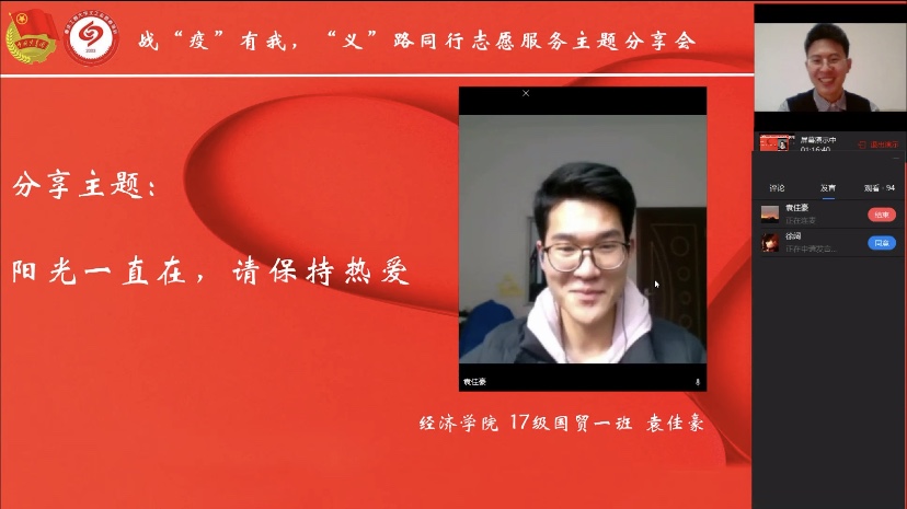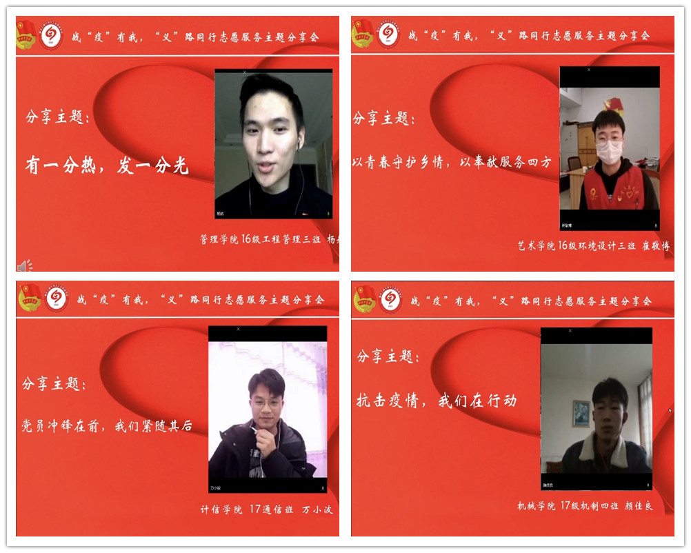 在我们的身边,也有一群青年志愿积极投入到这次共同的战“疫”中,尽己所能奉献担当,为夺取疫情防控的胜利注入了鲜活的青春力量。3月5日下午,校团委、校义工志愿者协会举行了“战‘疫’有我,‘义’路同行”志愿服务线上主题分享会,邀请到了抗疫志愿者管理学院杨航同学、艺术学院崔敬博同学、计算机科学与信息工程学院万小波同学、机械工程学院颜家良同学,以及身在湖北孝感的经济学院袁家豪同学与100余名师生一起走进微信直播间,分享交流那些抗疫的故事和感动。