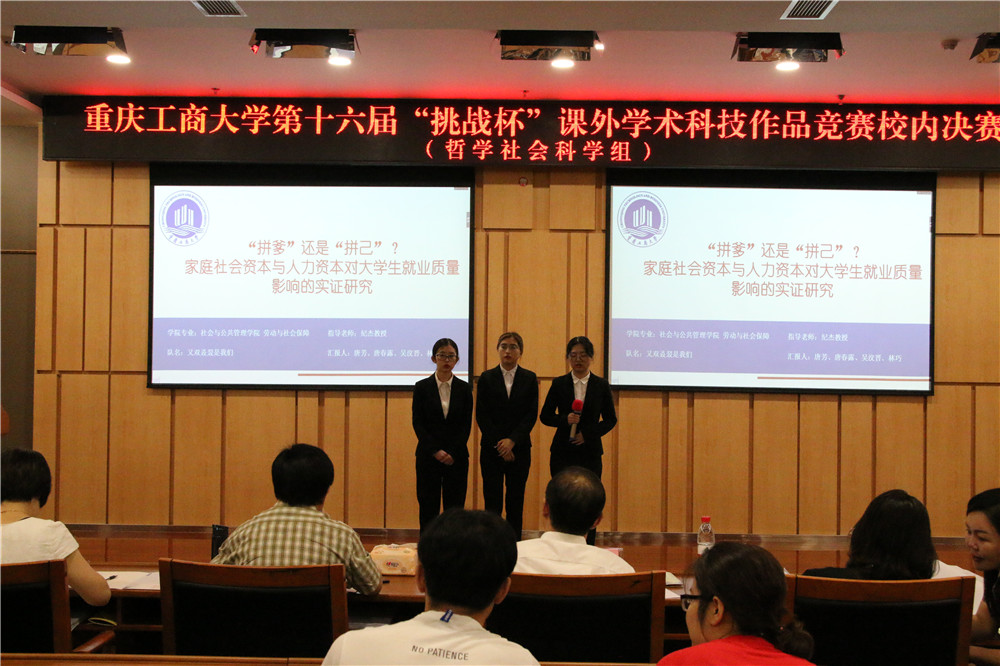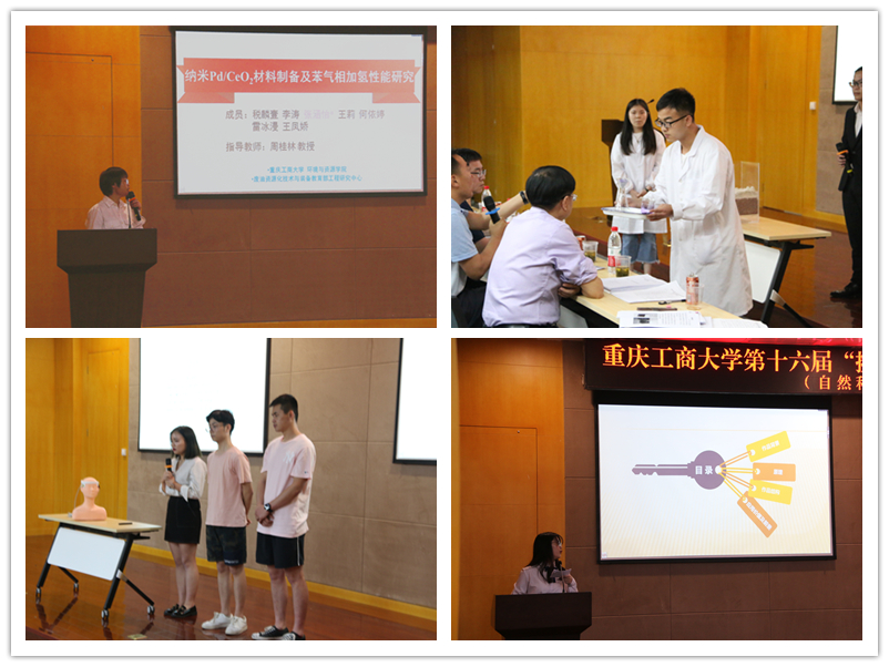 4月26日下午,由校团委主办、校学生会承办的第十六届“挑战杯”课外学术科技作品竞赛校内决赛在南岸校区新图书馆第一、第六会议室举行,哲学社会科学类和自然科学与科技发明制作类分别进行答辩。重庆邮电大学博士生导师徐仲伟教授,重庆社会科学院副院长张波教授,西南政法大学博士生导师赵树坤教授,365官网党委研工部副部长王燕教授,商务策划学院梁云教授担任社科组评审;西南大学化学化工学院院长李练兵教授,重庆大学博士生导师欧阳奇教授、戴欣教授,重庆交通大学材料科学与工程学院应用化学系副系主任郭小峰教授,教育部废油资源化技术与装备工程研究中心张贤明教授担任自然科学组评审。