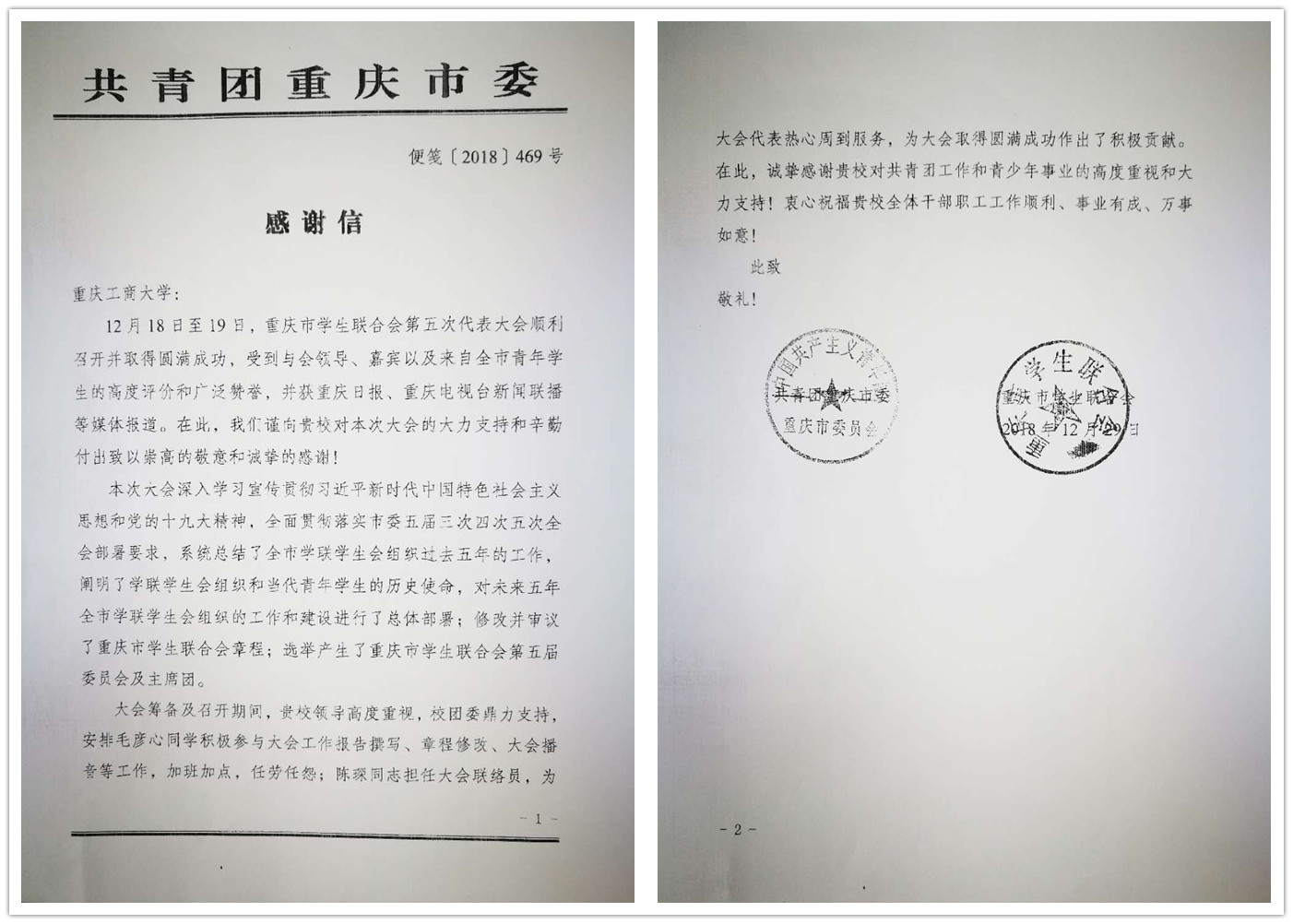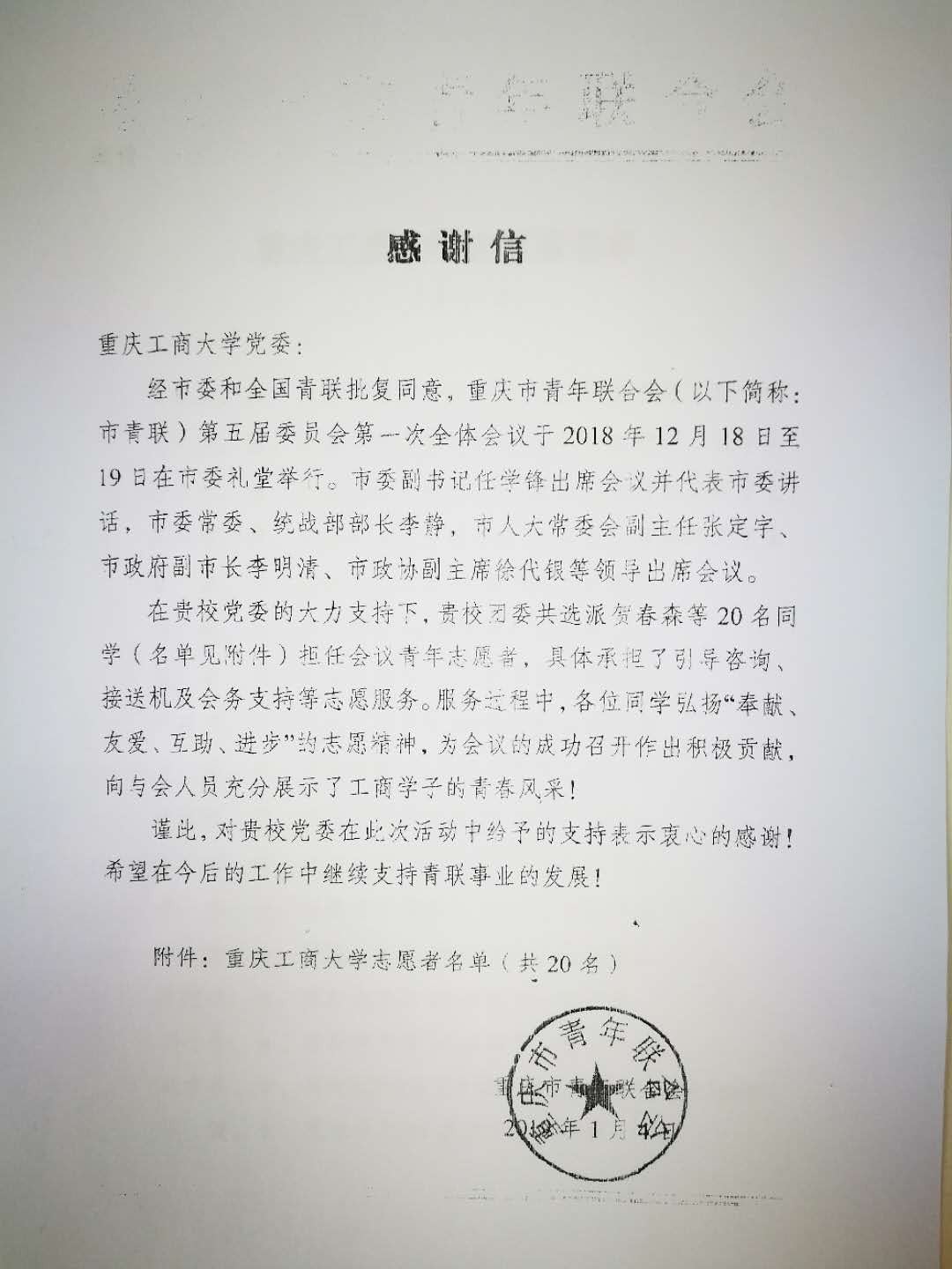 2018年12月18至19日,重庆市青年联合会第五届委员会第一次会议、重庆市学生联合会第五次代表大会在市委礼堂召开,365官网师生参与会议志愿服务,热心周到的服务获赞誉,共青团重庆市委、重庆市青联合会还专门向365官网发来了感谢信。