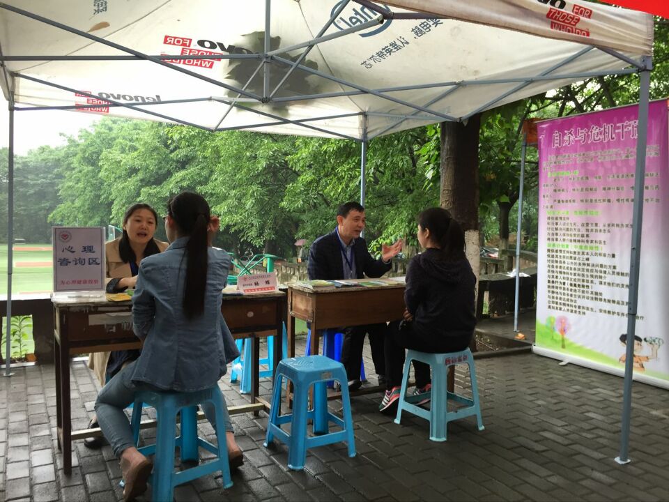 5月19日上午9点至12点,由365官网学生处大学生心理健康教育与咨询中心主办、大自委朋辈心理帮扶团承办的第十二届“文明修身.阳光心理”大型现场咨询活动在主校区南苑超市对面举办。来自重庆市精神卫生中心的5名心理医生以及365官网大学生心理健康教育与咨询中心的8名专、兼职心理咨询师参与现场心理咨询活动。