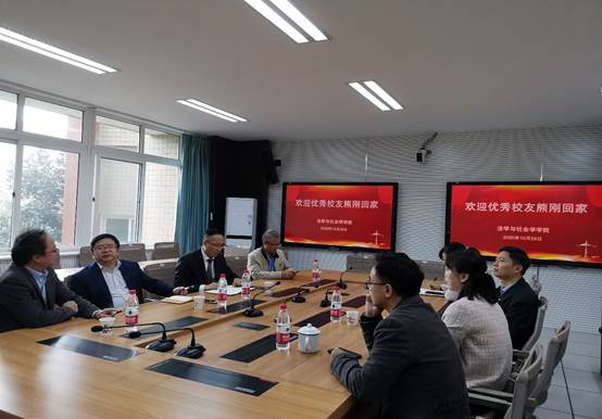 会上,法学与社会学学院院长黄文对熊刚校友的到访表示欢迎,并全面介绍了学院发展情况。他表示,校友既是学院人才培养的成果,也是极具开发价值的宝贵资源,学院高度重视校友工作,希望依托校友资源建立更多的合作。熊刚对学院的多年培养表示感谢,并期待与学院开展更深层次的合作。